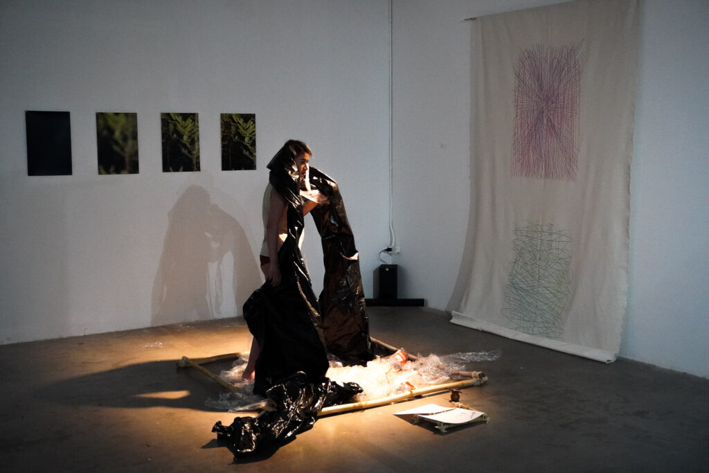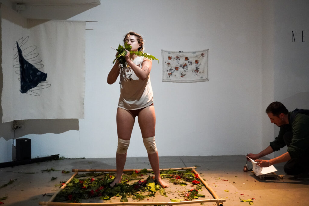 Las metodologías de trabajo que surgieron fueron de lo más heterogéneas. En un principio se planteó la búsqueda de materiales autóctonos susceptibles de ser utilizados en la producción de obra de forma sostenible y respetuosa con las restricciones que un espacio natural protegido tiene. Por otro lado, la deriva organizada a partir de caminatas guiadas adquirió un tinte performativo donde ambas artistas desarrollaron técnicas diversas que van desde la experimentación con pigmentos, el registro fotográfico, la recolección y el diario de campo. Encontraron una forma de llevarse la selva sin tener que extraer nada material de ella. El frotage como técnica de estampado esencial basado en el carácter indicial de las muestras, se desarrolló como un ritual que marcaba un alto en el camino y establecía una relación con el entorno desde otro campo del conocimiento: las artes. El proceso posterior consistía en poner en común las investigaciones de campo al finalizar el día. Los diarios y la recolección de objetos, plantas y vivencias configuraron un espacio común que acercó la labor creativa de ambas artistas. La forma en la que los afectos surgidos crearon un espacio seguro y productivo, se traduce en las obras conjuntas de esta muestra. El producto final es fruto de esa convivencia y muestra del aprendizaje. Nervadura es la consecuencia de este proceso que no terminó en la residencia, sino que marcó una reflexión posterior que ahora mismo se puede ver en la Galería Q, de la Universidad San Francisco de Quito.