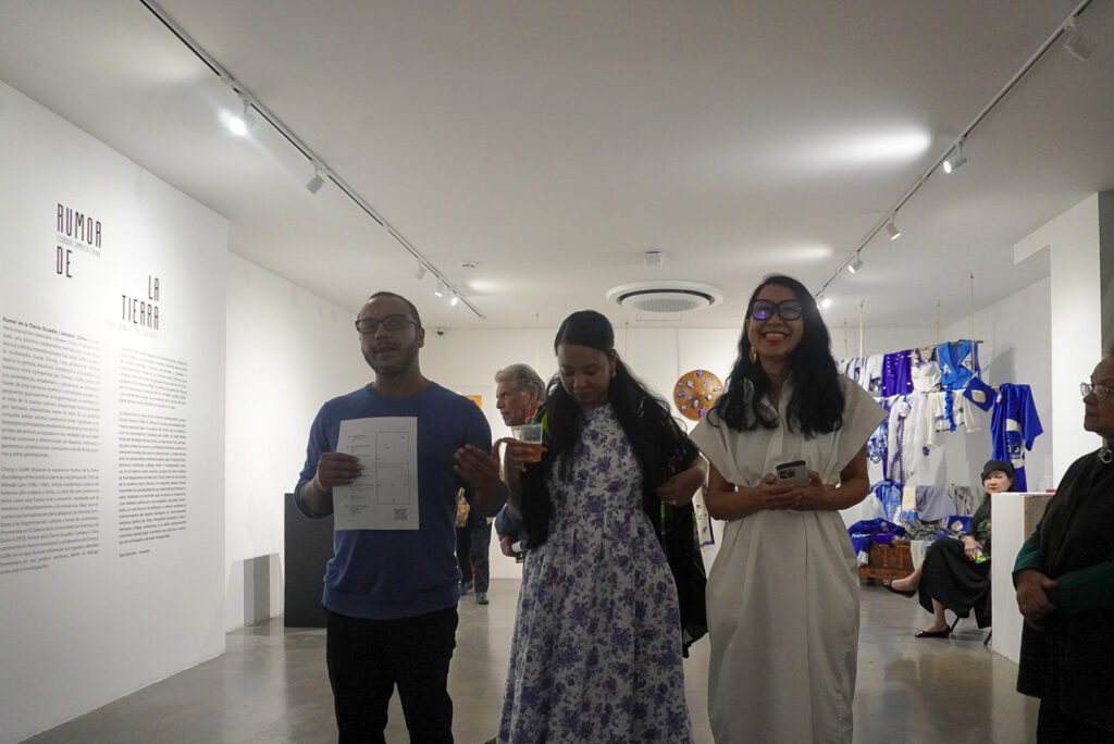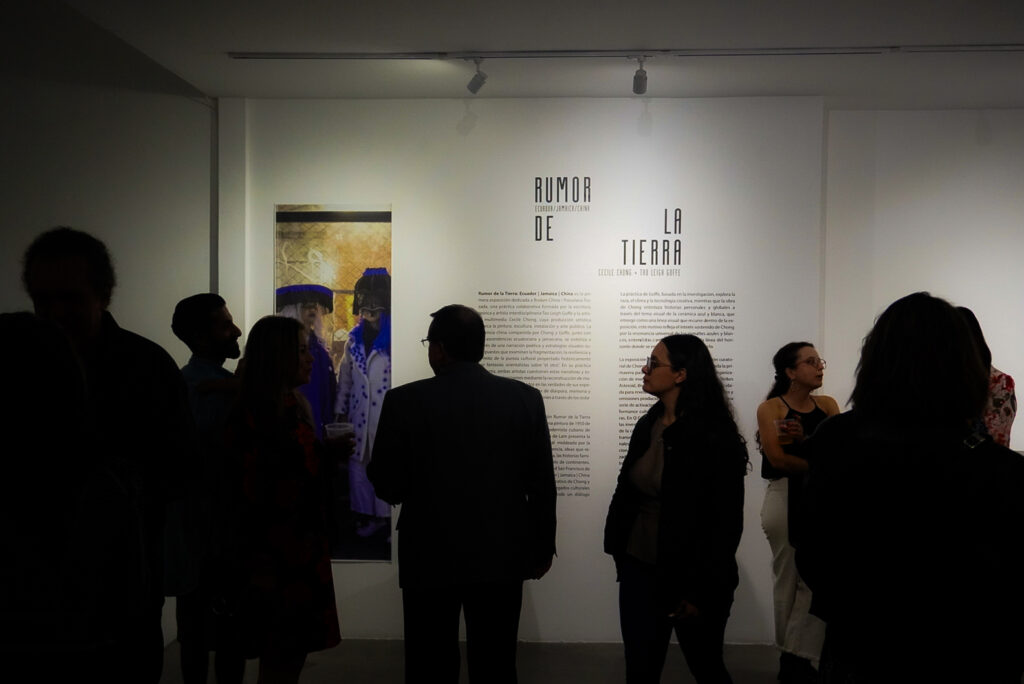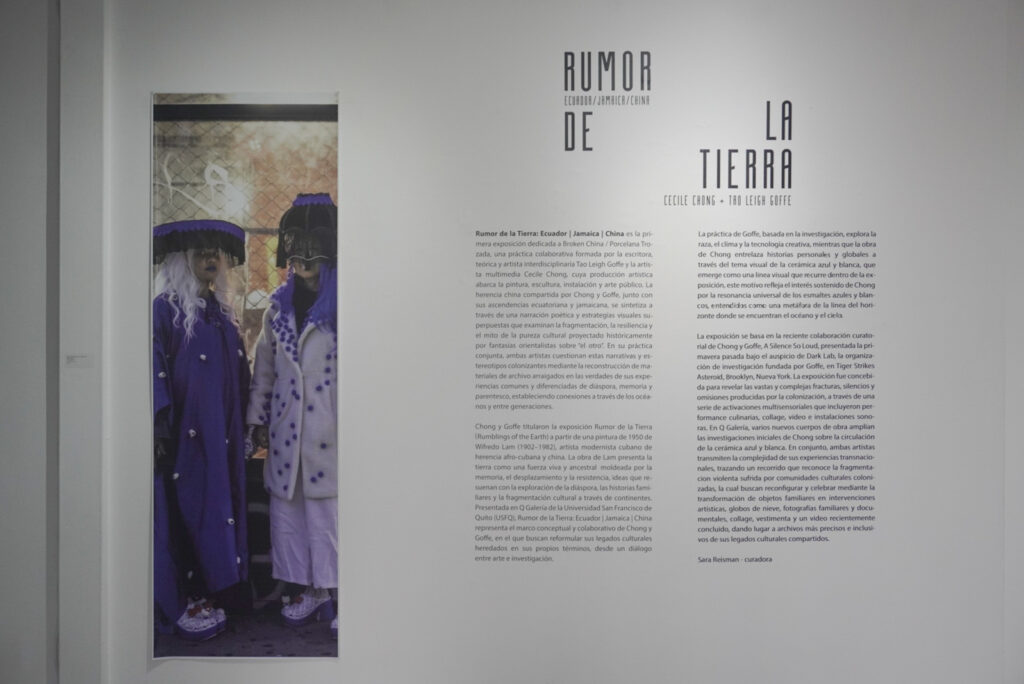 Chong y Goffe titularon la exposición Rumor de la Tierra (Rumblings of the Earth) a partir de una pintura de 1950 de Wifredo Lam (1902–1982), artista modernista cubano de herencia afro-cubana y china. La obra de Lam presenta la tierra como una fuerza viva y ancestral, moldeada por la memoria, el desplazamiento y la resistencia, ideas que resuenan con la exploración de la diáspora, las historias familiares y la fragmentación cultural a través de continentes. Presentada en Q Galería de la Universidad San Francisco de Quito (USFQ), Rumor de la Tierra: Ecuador | Jamaica | China representa el marco conceptual y colaborativo de Chong y Goffe, en el que buscan reformular sus legados culturales heredados en sus propios términos, desde un diálogo entre arte e investigación. La práctica de Goffe, basada en la investigación, explora la raza, el clima y la tecnología creativa, mientras que la obra de Chong entrelaza historias personales y globales a través del tema visual de la cerámica azul y blanca, que emerge como una línea visual que recurre dentro de la exposición, Este motivo reflejando el interés sostenido de Chong por la resonancia universal de los esmaltes azules y blancos, entendidos como una metáfora de la línea del horizonte donde se encuentran el océano y el cielo.