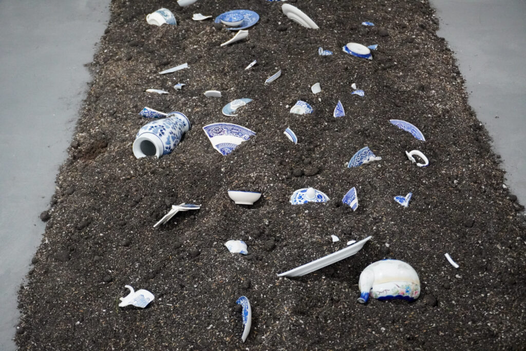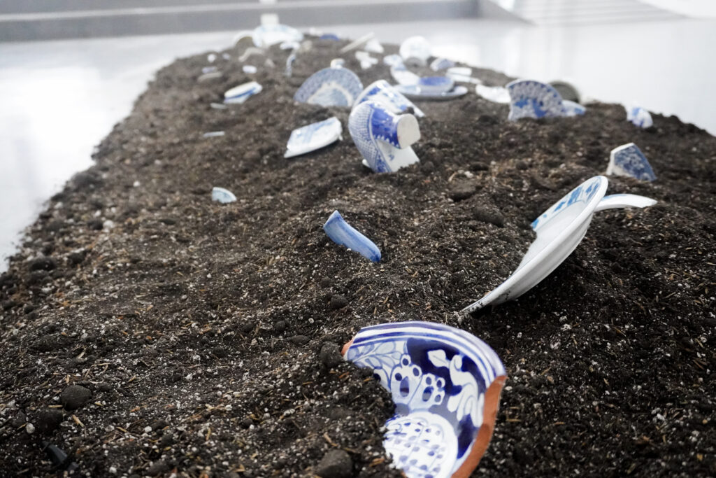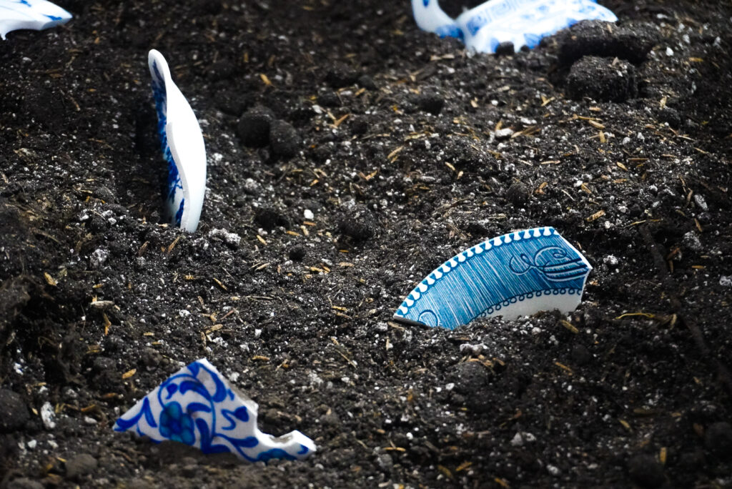 Montículos de tierra y fragmentos de porcelana