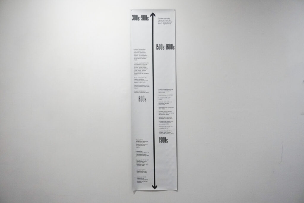 Rumor de la Tierra: Ecuador | Jamaica | China es la primera exposición dedicada a Broken China / Porcelana Trozada, una práctica colaborativa formada por la escritora, teórica y artista interdisciplinaria Tao Leigh Goffe y la artista multimedia Cecile Chong, cuya producción artística abarca la pintura, escultura, instalación y arte público. La herencia china compartida por Chong y Goffe, junto con sus ascendencias ecuatoriana y jamaicana, se sintetiza a través de una narración poética y estrategias visuales superpuestas que examinan la fragmentación, la resiliencia y el mito de la pureza cultural proyectado históricamente por fantasías orientalistas sobre “el otro”. En su práctica conjunta, ambas artistas cuestionan estas narrativas y estereotipos colonizantes mediante la reconstrucción de materiales de archivo arraigados en las verdades de sus experiencias comunes y diferenciadas de diáspora, memoria y parentesco, estableciendo conexiones a través de los océanos y entre generaciones.