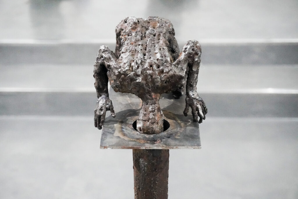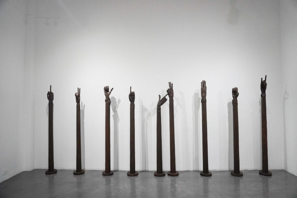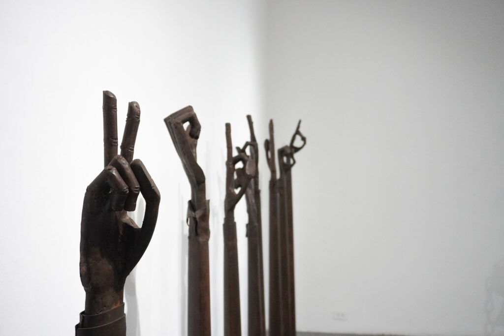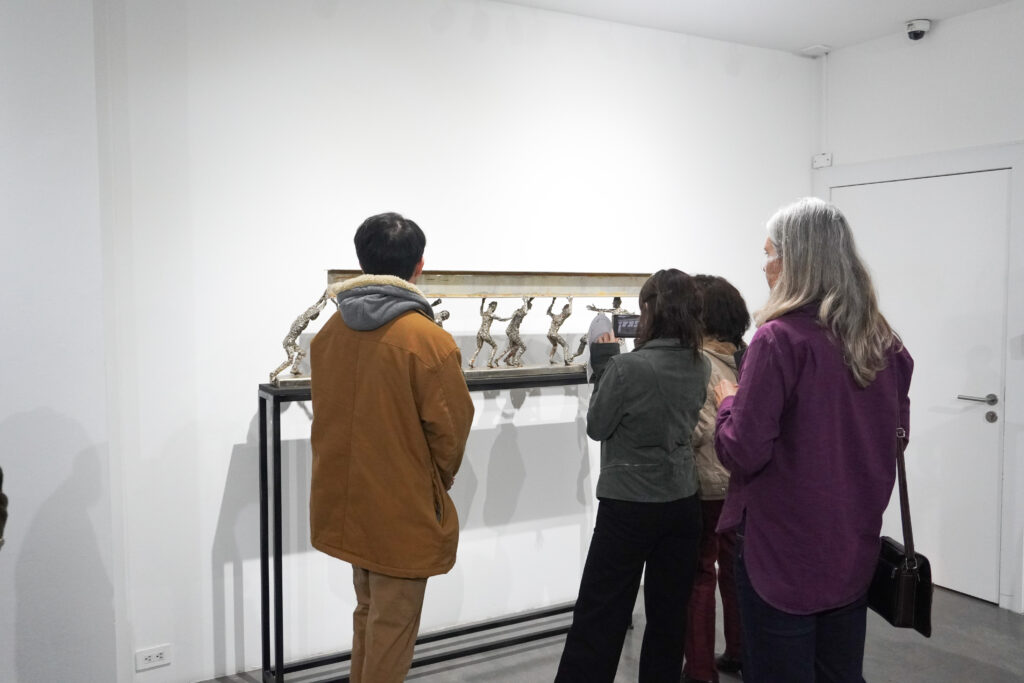 En STRUGGLE, estas características permean todas las esculturas y nos permiten acercarnos a esta mirada sui generis del mundo, donde cada una de las piezas contienen pistas y claves que ofrecen una ruta de interpretación sin necesidad de ser ilustrativas. El uso de la figura y las distintas gestualidades que el cuerpo puede comunicar funcionan como estrategias que habilitan la lectura tanto para el erudito como para quien no frecuenta el arte.
