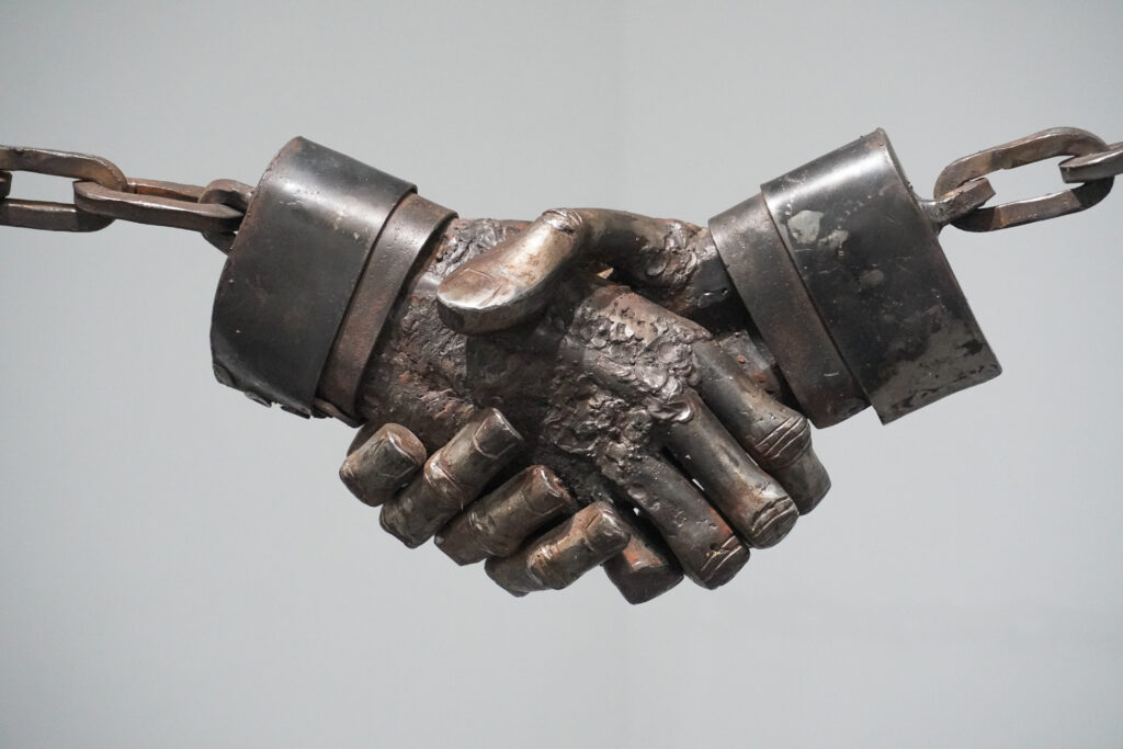 En Introspection, la figura esconde su cabeza dentro de un hueco, manifestando a través del cuerpo una condición vinculada a la psique. En esculturas como Heavy Lifting, las dinámicas de poder se evidencian no como una particularidad o especificidad histórica, sino como condición humana, mientras que en Art of the Deal: Homage to Donald Trump, Taikeff plantea un apretón de manos —tradicionalmente entendido como símbolo del cierre de un acuerdo mutuo—pero aquí, utiliza las tensiones que la gravedad ejerce en el ensamblaje de la escultura para producir un desbalance: uno es favorecido más que el otro, y sin embargo, ya está atrapado; no puede salir del “deal”.